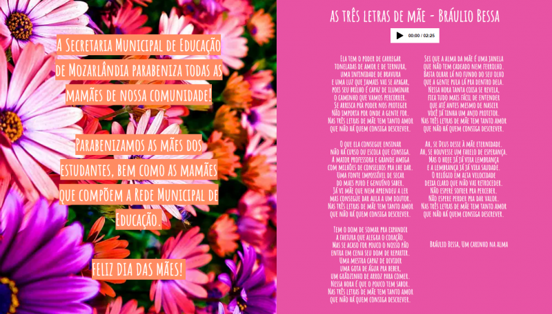 Para o mês de maio, mês em que se comemora o Dia das Mães, a Secretaria Municipal de Educação preparou uma singela homenagem a essas que são essenciais para todos nós, e, para isso, trouxe um poema de Bráulio Bessa que pode ser lido e ouvido na Plataforma Digital de Ensino Remoto.